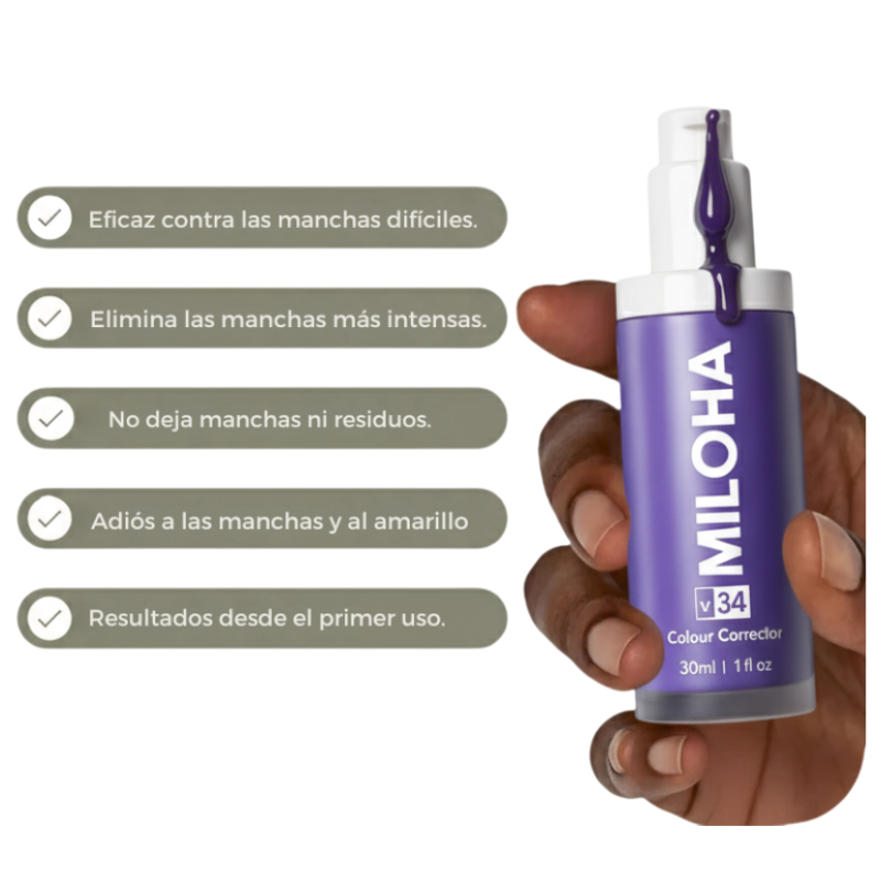 MILOHA V34 es un corrector de color que neutraliza los tonos amarillos, revelando un blanco natural y duradero. No es un simple maquillaje, es una transformación real.