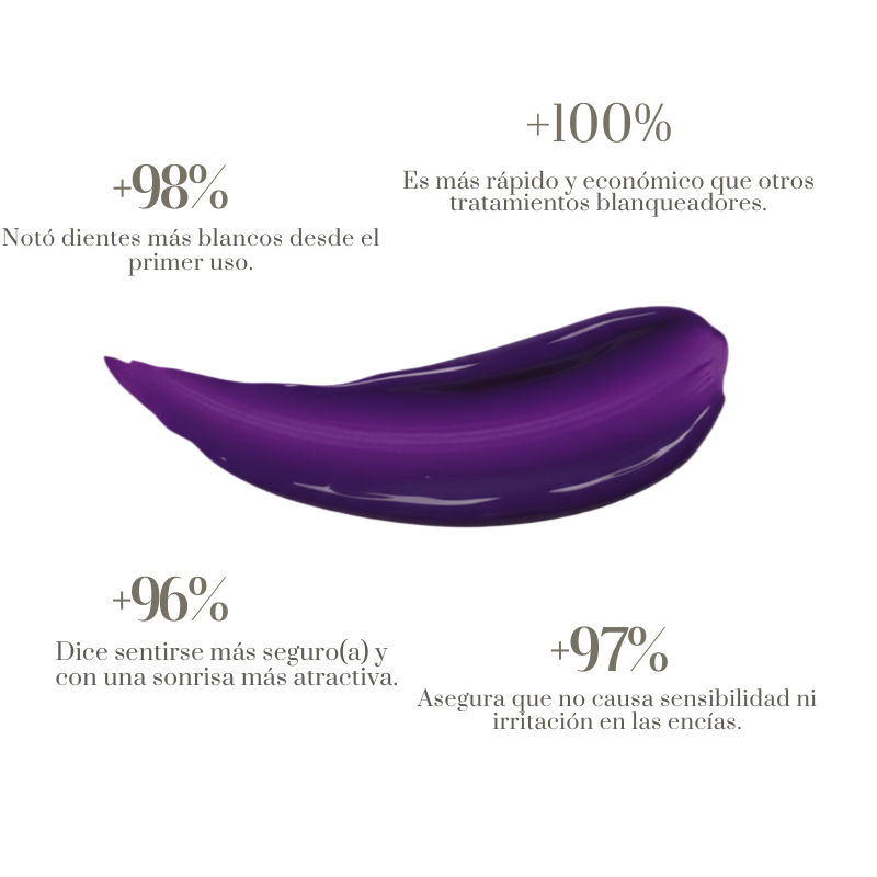 Corrige visualmente el tono amarillo desde el primer uso gracias a su fórmula violeta.Sin peróxidos · Apto para dientes sensibles · Uso diario